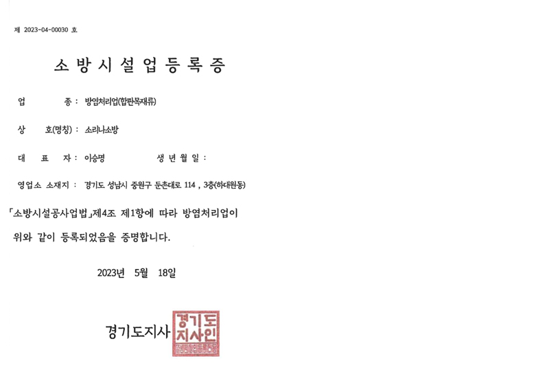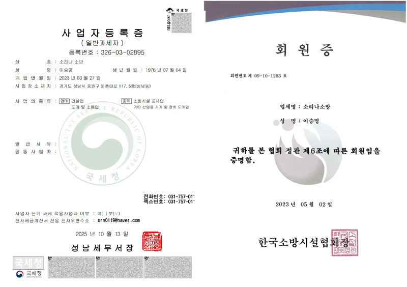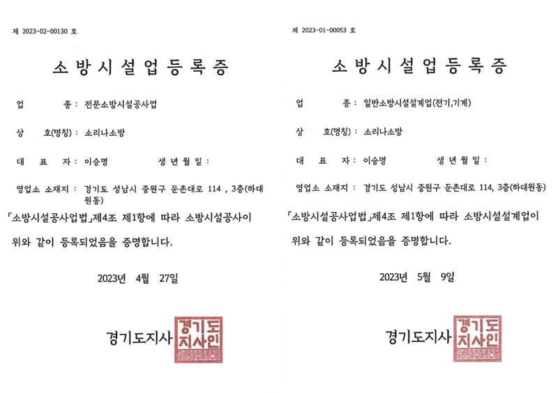 전문소방시설공사업등록증 / 일반소방시설설계업등록증